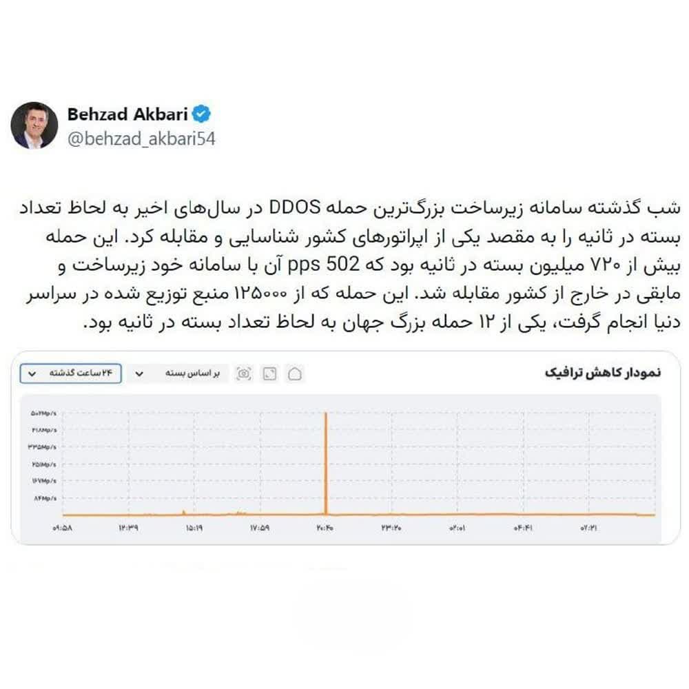 🔹مدیرعامل شرکت ارتباطات زیرساخت: شب گذشته سامانۀ زیرساخت بزرگترین حملۀ DDoS در سالهای گذشته بهلحاظ تعداد بسته در ثانیه را به مقصد یکی از اپراتورهای کشور شناسایی و مقابله کرد.