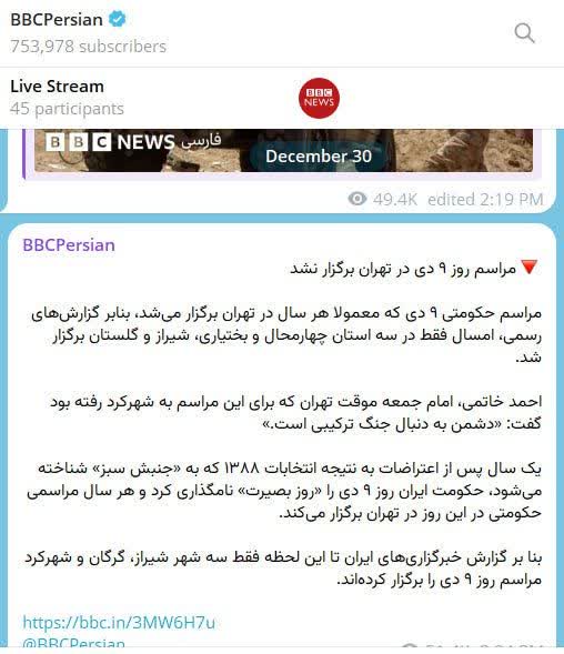 🔹بیبیسیِ فارسی عصر امروز در خبری نوشت که مراسم «مراسم روز ۹ دی در تهران برگزار نشد»!