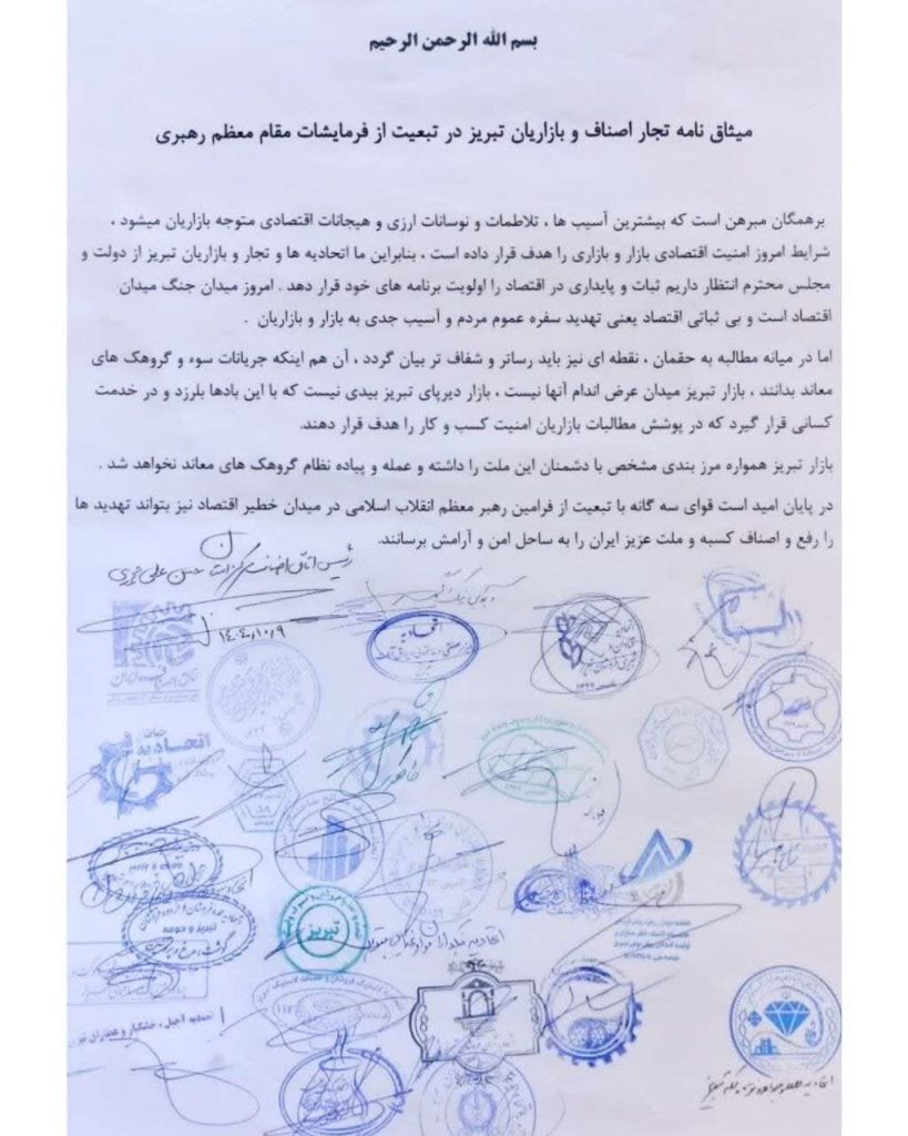 🔹تجار و بازاریان تبریز همچنین با تأکید بر لزوم تمکین به قانون و تبعیت از منویات رهبر معظم انقلاب اسلامی، از مسئولان خواستهاند با اتخاذ تصمیمات کارشناسی و مؤثر، زمینه ثبات اقتصادی و بهبود شرایط کسبوکار را فراهم کنند.