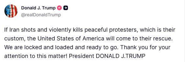🔹اگر ایران به معترضان مسالمتجو شلیک کند و آنها را بهطور خشونتآمیز بکشد، کاری که معمولاً انجام میدهند، ایالات متحده به کمکشان خواهد آمد. ما آمادهایم.