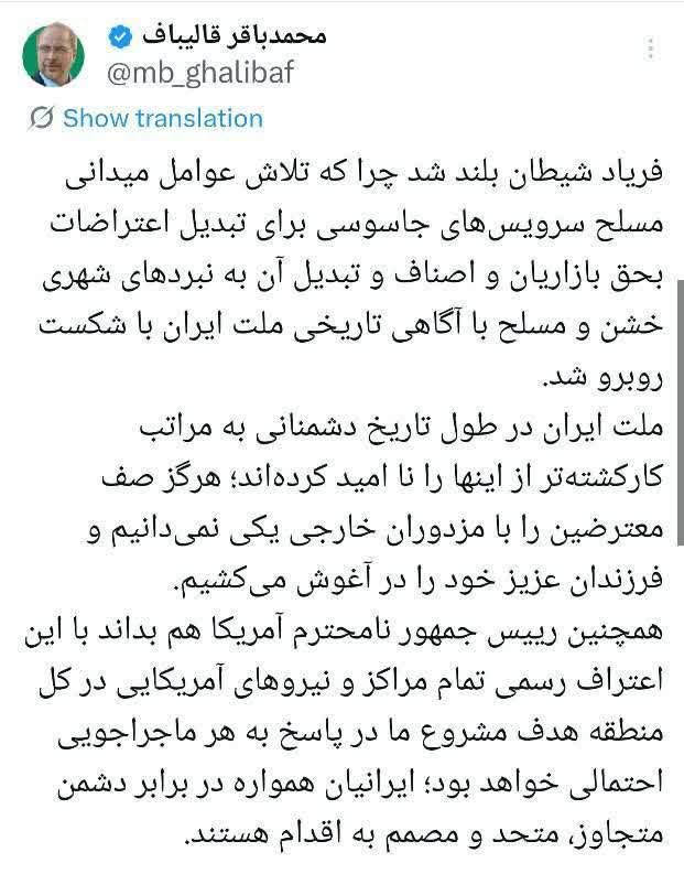 🔹ملت ایران در طول تاریخ دشمنانی به مراتب کارکشتهتر از اینها را ناامید کردهاند؛ هرگز صف معترضین را با مزدوران خارجی یکی نمیدانیم و فرزندان عزیز خود را در آغوش میکشیم.