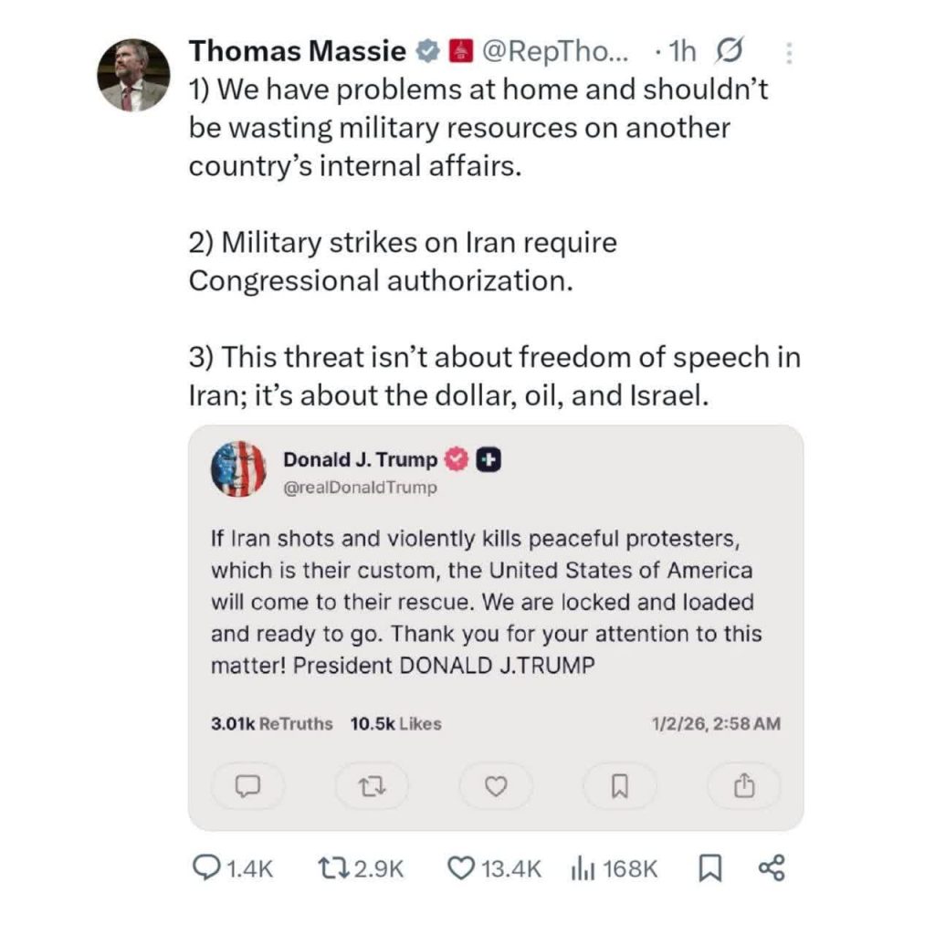 🔹️تامِس ماسی (نماینده جمهوریخواه کنگره آمریکا) در واکنش به تهدید ترامپ علیه ایران نوشته است: