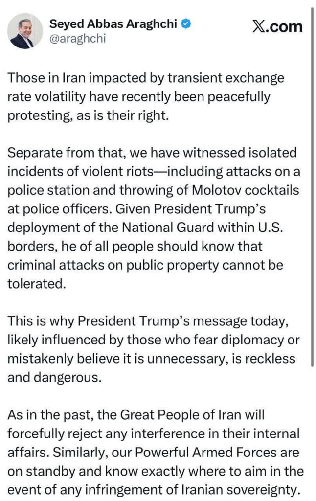 🔹به همین دلیل است که پیام امروز پرزیدنت ترامپ، که احتمالاً تحت تأثیر کسانی است که از دیپلماسی میترسند یا به اشتباه معتقدند دیپلماسی غیرضروری است، بسیار غیرمسئولانه و خطرناک است.