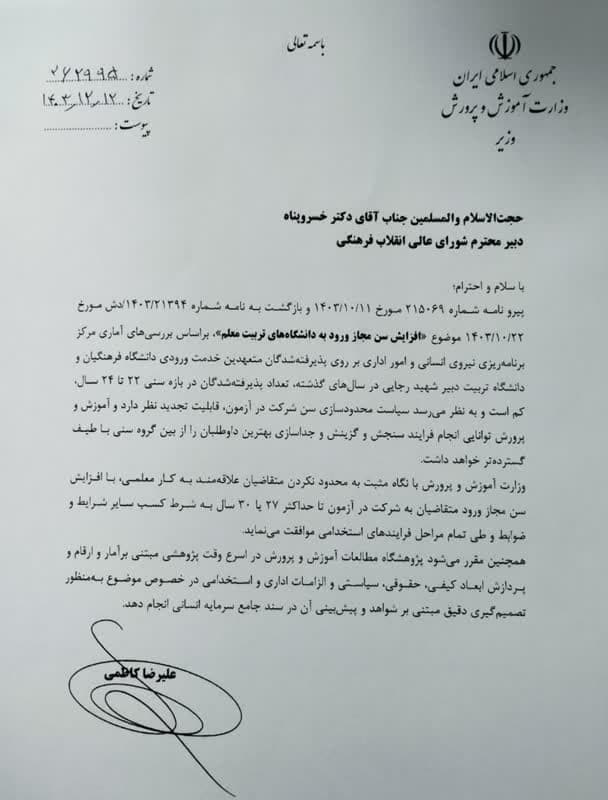 امروز سخنگوی کمیسیون آموزش مجلس اعلام کرد که نامهٔ وزیر آموزشوپرورش به دبیر شورای عالی انقلاب فرهنگی در زمینهٔ پیشنهاد افزایش سن داوطلبان دانشگاه فرهنگیان به ۲۷ یا ۳۰ سال صادر و ارسال شده است.