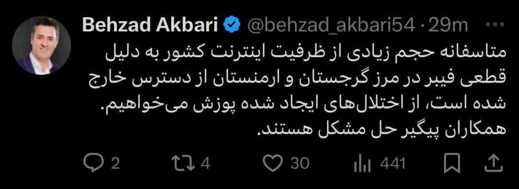 🔹متاسفانه حجم زیادی از ظرفیت اینترنت کشور به دلیل قطعی فیبر در مرز گرجستان و ارمنستان از دسترس خارج شده است، از اختلالهای ایجاد شده پوزش میخواهیم. همکاران پیگیر حل مشکل هستند.