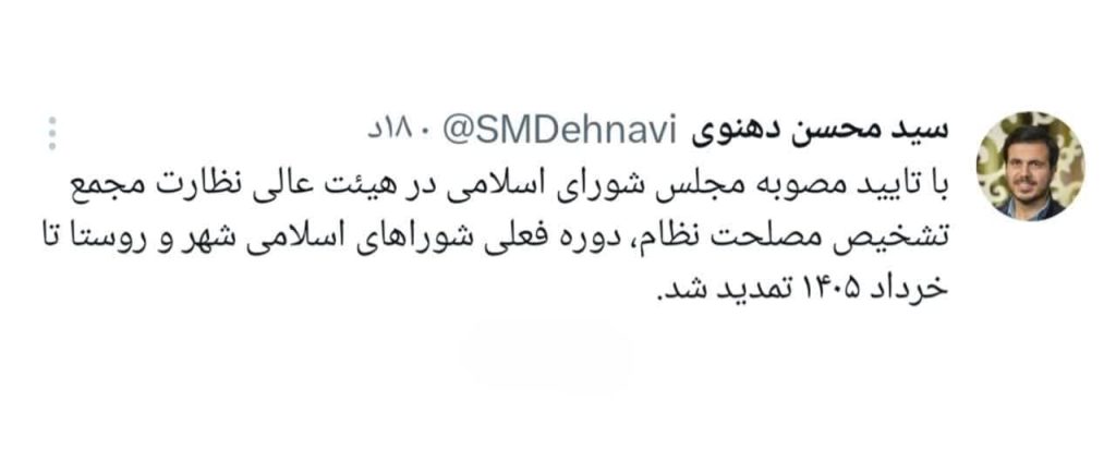 دهنوی، سخنگوی مجمع تشخیص مصلحت نظام: با تایید مصوبه مجلس شورای اسلامی در هیئت عالی نظارت مجمع تشخیص مصلحت نظام، دوره فعلی شوراهای اسلامی شهر و روستا تا خرداد ۱۴۰۵ تمدید شد.