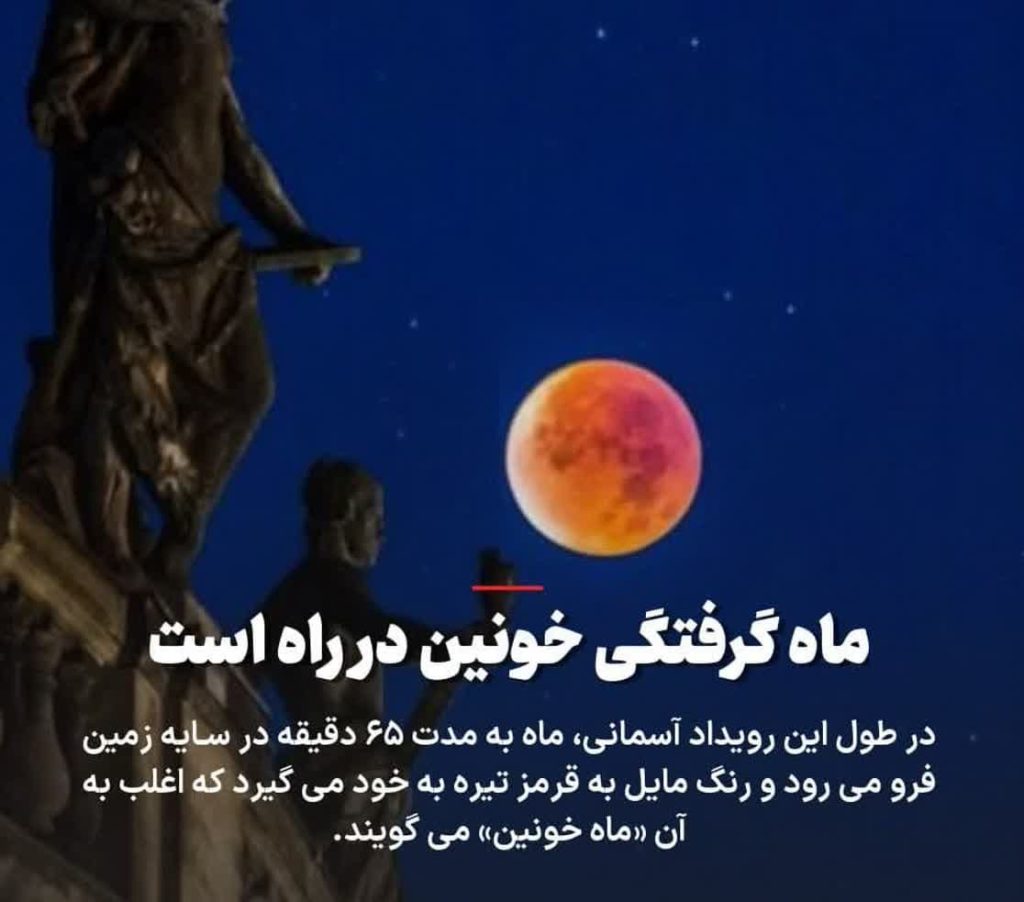 🔹در طول این رویداد آسمانی، ماه به مدت ۶۵ دقیقه در سایه زمین فرو میرود و رنگ مایل به قرمز تیره به خود میگیرد که اغلب به آن «ماه خونین» میگویند.
