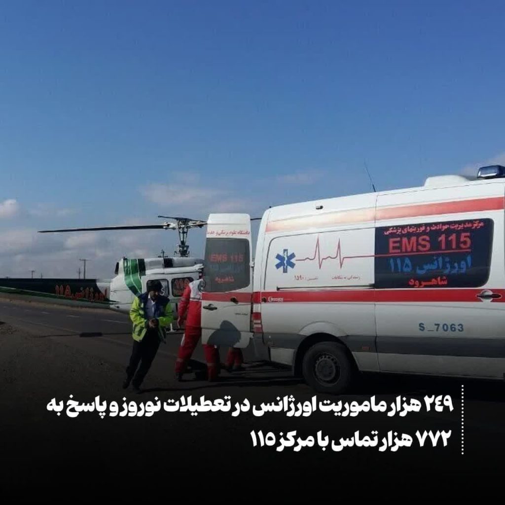 🔹ماموریتهای امداد و نجات سازمان اورژانس طی این مدت در قالب اعزام زمینی بیش از ۴۱ هزار و ۳۴۱ مصدوم حوادث ترافیکی با آمبولانس، انتقال هوایی ۲۰۲ مصدوم و بیمار بدحال با ۱۹۹ ماموریت پروازی، انتقال ۵۲ مصدوم و بیمار از طریق آمبولانس دریایی و بازگشت به زندگی(احیا) ۱۶۴ بیمار توسط تکنیسین های اورژانس انجام شده است