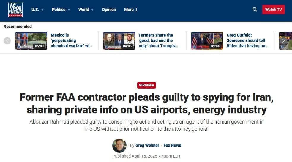 🔹 فاکس نیوز ادعا کرد، ابوذر رحمتی، شهروند آمریکا به نمایندگی از دولت و نیروهای اطلاعاتی ایران در آمریکا فعالیت کرده است. او بین سالهای ۲۰۱۷ تا ۲۰۲۴ بهعنوان پیمانکار برای سازمان هوانوردی فدرال کار میکرد.