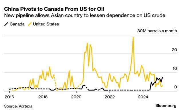 رسانههای غربی میگویند چین در ماه مارس ۷.۳ میلیون بشکه نفت از کانادا وارد کرده و واردات نفتش از آمریکا را به ۳ میلیون بشکه کاهش داده در حالی که در اوج خود در ژوئن ۲۹ میلیون بشکه وارد کرده بود.