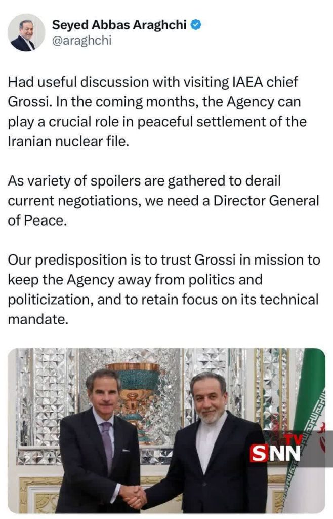 🔹گفتگوی مفیدی با آقای رافائل گروسی مدیر کل آژانس بین المللی انرژی اتمی داشتم. در ماههای آتی، آژانس میتواند نقش مهمی در حل و فصل مسالمت آمیز پرونده هستهای ایران ایفا کند.