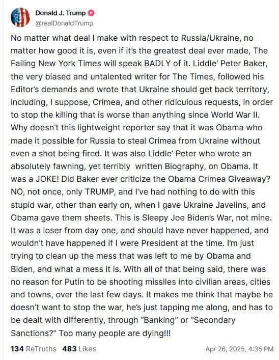 🔹ترامپ در یک پست در شبکه اجتماعی تروث در این مورد تشریح کرد: هیچ دلیلی وجود نداشت که پوتین در چند روز گذشته به مناطق غیرنظامی، شهرها و شهرستانها موشک شلیک کند. این باعث میشود فکر کنم که شاید او نمیخواهد جنگ را متوقف کند و باید با او طور دیگری برخورد شود، از طریق «بانکی» یا «تحریمهای ثانویه؟»