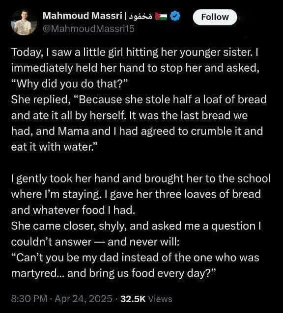🔹او جواب داد: چون او نصف یک قرص نان را برداشت و آن را به تنهایی خورد. آن آخرین نانی بود که داشتیم و من و مامان توافق کرده بودیم که آن را خرد کنیم و با آب بخوریم.
