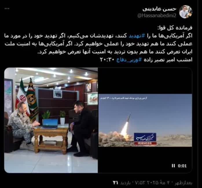 🔹فرمانده کل قوا: اگر آمریکاییها ما را تهدید کنند، تهدیدشان میکنیم، اگر تهدید خود را در مورد ما عملی کنند ما هم تهدید خود را عملی خواهیم کرد. اگر آمریکاییها به امنیت ملت ایران تعرض کنند ما هم بدون تردید به امنیت آنها تعرض خواهیم کرد.