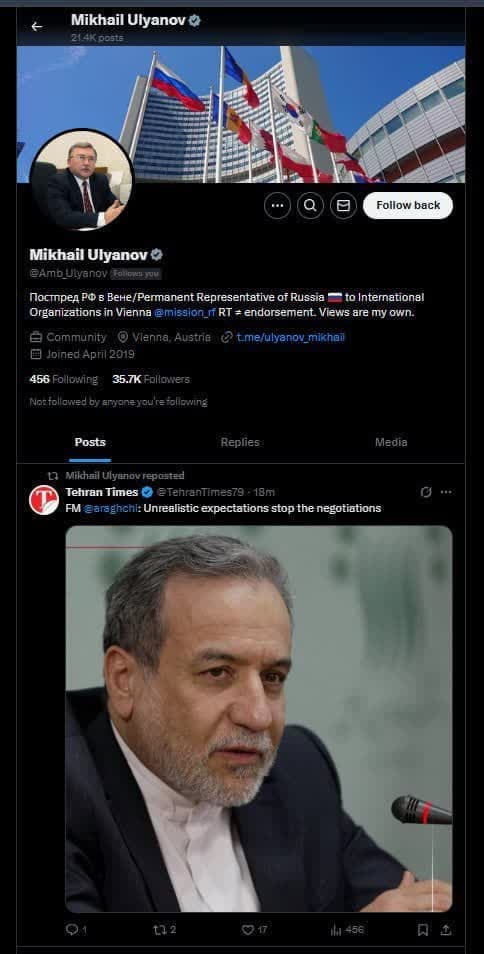 در این توئیت پاسخ عراقچی به اظهارات امروز ویتکاف نماینده ویژه ترامپ در مذاکرات هسته ای منتشر شده است. عراقچی در واکنش به موضع ویتکاف درباره لزوم توقف غنی سازی در ایران، گفته؛ انتظارات غیرواقعی باعث توقف مذاکرات می شود.