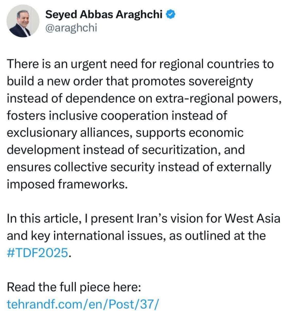کشورهای منطقه بیش از هر زمان دیگری نیازمند آن هستند که نظمی نوین بنا کنند، نظمی که؛ به جای وابستگی به قدرتهای فرامنطقهای، بر اصل حاکمیت ملی تأکید داشته باشد، به جای ائتلافهای شکننده، همکاری فراگیر را ترویج کند، به جای تمرکز بر امنیتمحوری، توسعه اقتصادی را در اولویت قرار دهد، و به جای چارچوبهای تحمیلی از سوی بازیگران خارجی، امنیت جمعی را تضمین کند.