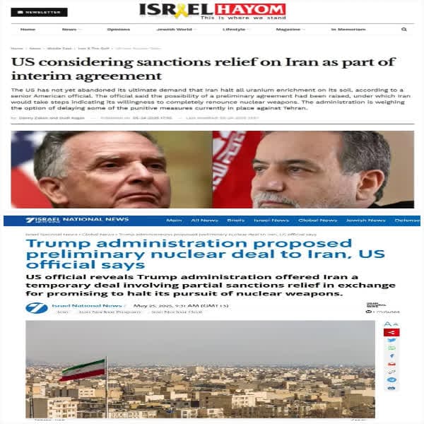 🔹 “کانال هفتم” رژیم صهیونیستی مدعی شد “در حالی که ایران خود را برای شکست احتمالی مذاکرات آماده میکند، دولت ترامپ «توافقی اولیه» به ایران پیشنهاد داده و وعده داده است که در صورت تعهد تهران به کنار گذاشتن تلاش برای دستیابی به سلاح هستهای، بخشی از تحریمها را کاهش خواهد داد.