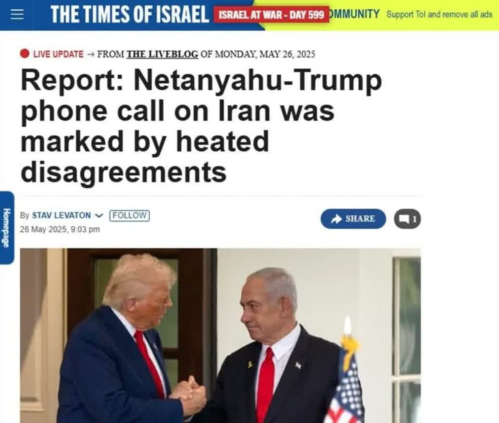 🔹 بنیامین نتانیاهو و دونالد ترامپ، روز پنجشنبه در جریان یک تماس تلفنی درباره نحوه مقابله با ایران، گفتوگویی پرتنش و تند داشتهاند—موضوعی که با ادعاهای قبلی مبنی بر رسیدن این دو رهبر به موضعی مشترک در زمینه جلوگیری از دستیابی تهران به سلاح هستهای، در تضاد است.